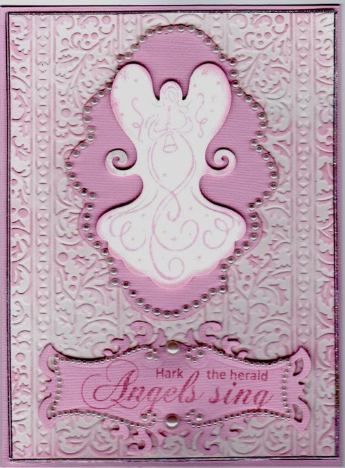 This new Heartfelt Creations Angel is so pretty and elegant. It also has a matching die cut. I stamped it with Distressed sugar spun ink, then I took pearls and lined the spellbinder die. The saying is part of this set and I used the fancy tag with the matching Want 2 scrap. Cuttlebug background and I sponged Spun Sugar over it. Added some holographic white peel off border. Check out the blogs today and see the beautiful creations.