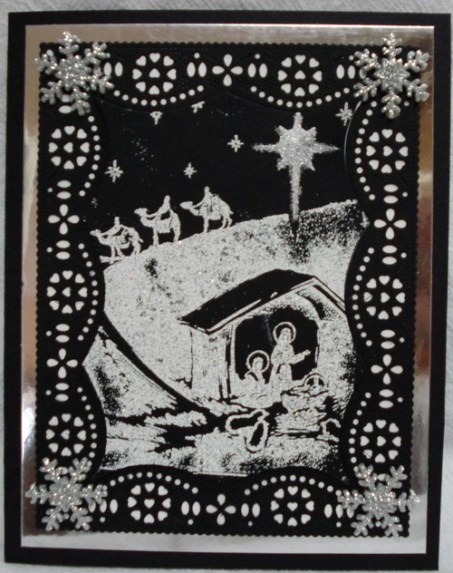 I am so thrilled and honored to be the guest designer for Flourishes this month. From the first time I discovered their stamps I've been hooked on the elegant and gorgeous stamp sets. The challenge this week is silhouettes and I used this beautiful First Noel set and embossed it in white on black paper. I added a beautiful carnival border from Cheery Lynn around the card and then some very sparkly silver snowflakes to the corners. Silver holographic mirror card and the base card is black. Please check out the Design Teams wonderful creations: